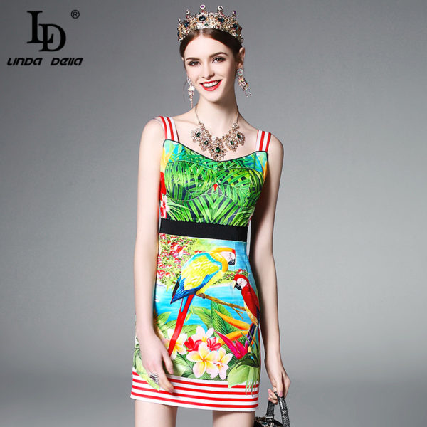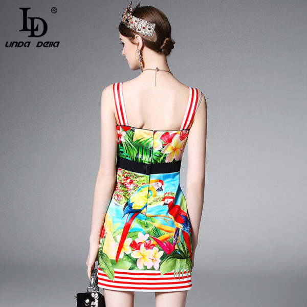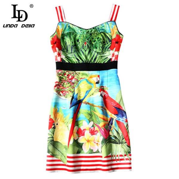 2017 Runway Summer Dress Women’s elegant Backless Spaghetti Strap Stripe Casual Vintage Flower Bird Printing Short Dress Bodycon