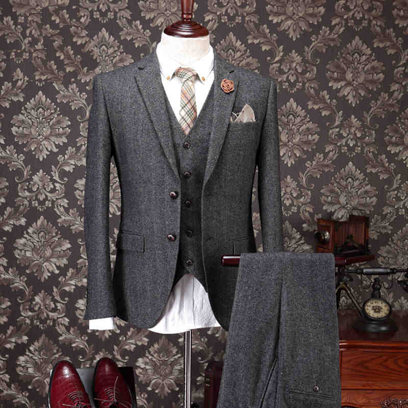 High Quality Man’s Wool Suits Male 3 Piece Suit With Vest and Pants For Wedding Dress Men Grey Vintage Suits Plus Size S-5XL